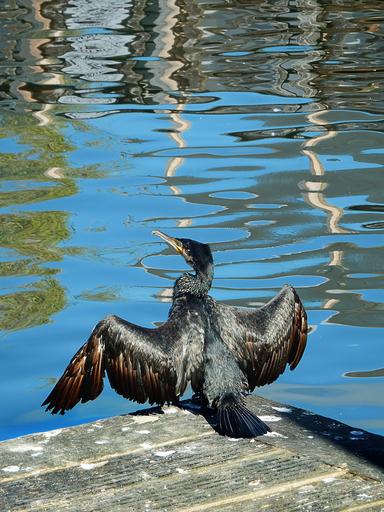 Keywords: cormorant drying wings sun water peaceful atmospheric port mirroring blue rest security