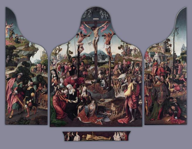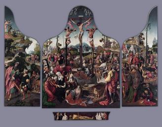 Keywords: Cornelis Engebrechtsz. - Crucifixion Altarpiece - WGA07521.jpg Artwork Creator Cornelis Engebrechtsz Other date ~ 1510-1520 Oil on panel cm 213 278 Institution Museum De Lakenhal 06 S+93 Kruisiging van Christus Other date ~ 1510 cm 198 5 146 central panel cm 15 109 predella cm 182 5 66 each wing 216171 LangSwitch The sacrifice of Isaac left ; The crucifixion middle ; The adoration of the brazen serpent right ; The mocking of Christ verso left ; Christ in distress sitting on the cold stone verso right ; The body of Adam flanked by Saint Martin of Tours Saint Augustine and the donors predella Het offer van Isaak links ; De kruisiging midden ; De aanbidding van de koperen slang rechts ; De bespotting buitenzijde links ; Christus op de koude steen buitenzijde rechts ; Het lijk van Adam geflankeerd door de HH Martinus van Tours en Augustinus en de stichters predella ~ 1515-1517 cm 213 278 20041926 Kreuzigung Christi 1508/1512 http //www wga hu/html/e/engelbre/crucifix html Crucifixion Altarpiece Other date decade 1510 object history between 1508 1522 commission Klooster Mariƫnpoel Oegsgeest ProvenanceEvent 1604 transfer LangSwitch das the au het stadhuis Leiden Klooster Mariƫnpoel Oegsgeest ProvenanceEvent 1869 conveyance LangSwitch das the au ~ Museum De Lakenhal Leiden stadhuis Leiden credit line accession number S 93 WGA link 7521 http //www wga hu/art/e/engelbre/crucifix jpg http //www wga hu/html/e/engelbre/crucifix html painting religious Netherlandish 1501-1550 PD-old-100 Cornelis Engebrechtsz 1510 Paintings in the Museum De Lakenhal Engebrechtsz Cornelis 1510 16th-century oil on panel paintings in the Netherlands WGA form painting WGA type religious WGA School Netherlandish WGA time period 1501-1550 Altar paintings 16th-century paintings of the Crucifixion of Christ Donor portraits with Crucifixion Christ on the Cold Stone