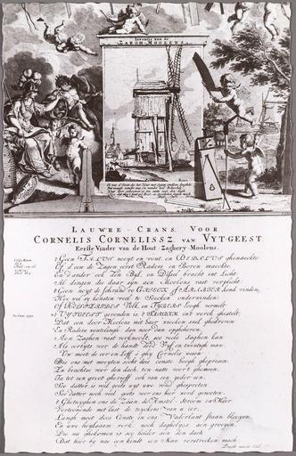 Keywords: Cornelis van Uitgeest - Het Juffertje zaagmolen.jpg Allegory for the invention of the saw-mill by Cornelis van Uitgeest Allegorie op de Inventie van de zaagmolen met Minerva Aeolus en putti 117083 http //www beeldbank noord-hollandsarchief nl/memorix/1d9cc352-fb8f-11df-9e4d-523bc2e286e2 North Holland Archives circa 1713 1752 Jan Schenk; Adolf van der Laan <code> Inventie van de zaegh-moolens/ Ik was d' eerst' die het hout met Sagen stucken Saeghde / Dat menigh wonder was En wonder wel behaechde / Waer door 't gekomen is ten nutte voor den dagh / Hoe datmen 't hout op 't Best en Spoedichst Sagen magh / H I Soet / Lauwre-Crans voor Cornelis Cornelissz van Vyt-geest Eerste Vinder van de Hout¬Zaghery-Moolens / Ovid Metam lib 8 Polid virg lib 3 cap 34 Diod lib 3 / 't Geen Talus nooyt en vont en Dedalus genaeckte/ of d'een de zagen eerst raders en boren maeckte / en d'ander ook den Byl en dissel bracht int licht/ al dingen die daar syn aen Moolens vast verplicht / 't geen noyt de schrand're Grieck of Arabier kond vinden/ Hoe wel sy konsten veel te soecken onderwinden/ of Hesperides Volk en Tybers boogh vermelt/ anno 1592 't Uytgeest gevonden is 't Saerdam in't werck ghestelt;/ Dat een door Moolens met haer wiecken snel ghedreven/ en Raders wentelingh dan neer dan opgheheven / Aen Zaghen vast verknockt soo vele Saghen kan/ Als eertyts voor de handt deed Vyf en twintigh man / Uw' moet de eer en Loff o ghy Cornelis wesen/ Die ons met moeyten socht dees conste boogh ghepresen / En brachtse voor den dach ten nutte voor 't ghemeen / Ja tot een groot gherieff ook van een yeder een / Soo datter is veel goets uyt uwe vond ghesproten/ Soo datter noch veel goets voor ons hier word genooten / 't Ghetuyghen ons de Zaan de Amstel-Stroom en Meer/ Vertoonende met lust de teyckens van u eer / Langh moet dees Conste in ons Vaderlant staan bloeyen / Die nu ghekomen is soo helder aen den dach/ Dat hier by nae een kindt een Man verstrecken mach / Deught maekt edel </code> PD-old 18th-century engravings Sawmills in the Netherlands Uitgeest Hesperides mythology Adolf van der Laan |