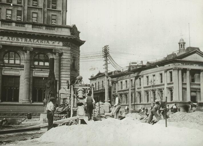 | Keywords: dunedin construction road historic queens gardens queensgardens rattray street rattraystreet outdoor blackandwhite building architecture monochrome black and white DCC Archives, Photo 330/38, Street Works - Lantern Slide Collection DCC Archives, Photo 330/38, Street Works - Lantern Slide Collection |