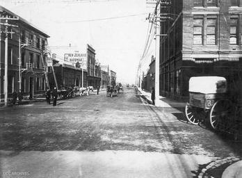View Original:Corner_of_Stuart_and_Cumberland_Street_showing_Law_Courts_Hotel_and_NZ_Hardware_Company.jpg (2397x1765)