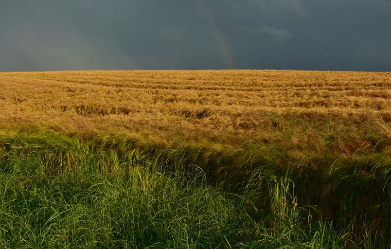 Keywords: cornfield dusk field nature summer staple food grain ear barley cereals infructescence agriculture sky abendstimmung twilight evening sky mood dramatic weather