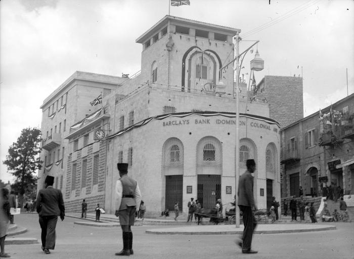 Keywords: Coronation. King George VI. Decorations, day scenes (King David, Barclays, Julian Day, Fast Hotel). 1937. matpc.16993.jpg Jerusalem en Coronation King George VI Decorations day scenes King David Barclays Julian Day Fast Hotel <br /> Summary Photo shows Barclay's Bank decorated with British flags and bunting in 4 5 html Information field Notes Title and date from photographer's logbook Matson Registers v 1 1934-1939 Gift; Episcopal Home; 1978 html LOC-image matpc 16993 American Colony Jerusalem Photo Dept photographer 1937-05-12 PD-Matson Historical images of Barclays Bank Dominion Colonial and Overseas Jerusalem Historical images of Jaffa Road 1937 in Jerusalem Nitrate negatives Taken with Stokes 75 |