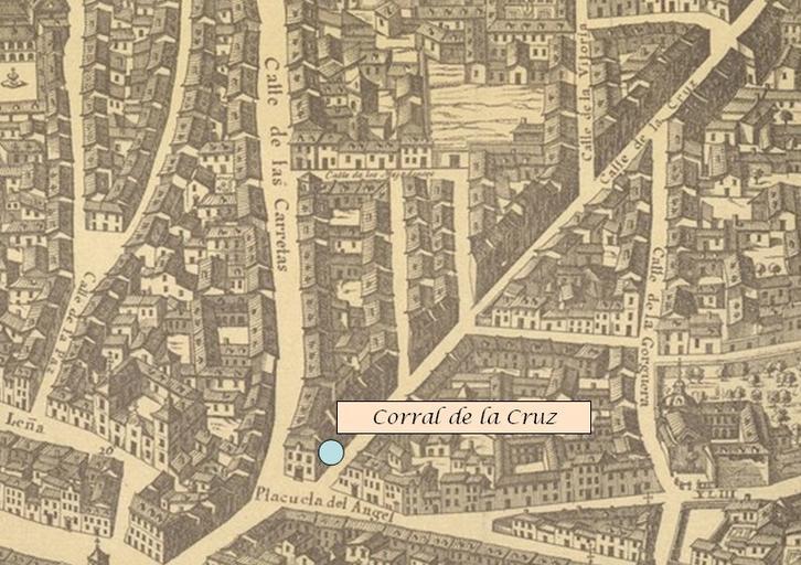 Keywords: Corral de la Cruz. Madrid 1656.jpg es Localización aproximada del antiguo corral de comedias de la Cruz en Madrid en el plano de Pedro Texeira hacia 1656 1656 Este archivo se relaciona con File Texeira centro madrid austrias jpg Mapa de Madrid 1656 detalle Obra de Pedro Texeira Biblioteca Regional Joaquín Leguina de Madrid http //bvpb mcu es/es/consulta/registro cmd id 434677 Biblioteca Virtual del Patrimonio Bibliográfico Servicio de cartografía del Ministerior de Romanto del Estado Español Biblioteca Nacional de España Pedro Texeira dominio público PD-old-100 Uploaded with UploadWizard Pedro Teixeira's Topographia de la Villa de Madrid Corrales de comedias |