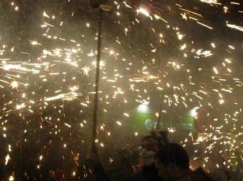 | Keywords: Correfocs (literally in English "fire-runs") are among the most striking features present in Catalan festivals. In the correfoc, a group of individuals will dress as devils and light fireworks - fixed on devil's pitchforks or strung above the route. Dancing to the sound of a rhythmic drum group, they set off their fireworks among crowds of spectators. The spectators that participate dress to protect themselves against small burns and attempt to get as close as possible to the devils... running with the fire. Other spectators will watch from 'safe' distances, rapidly retreating as necessary. culture catalan correfoc terrassa països catalans fmterrassa2016 |
