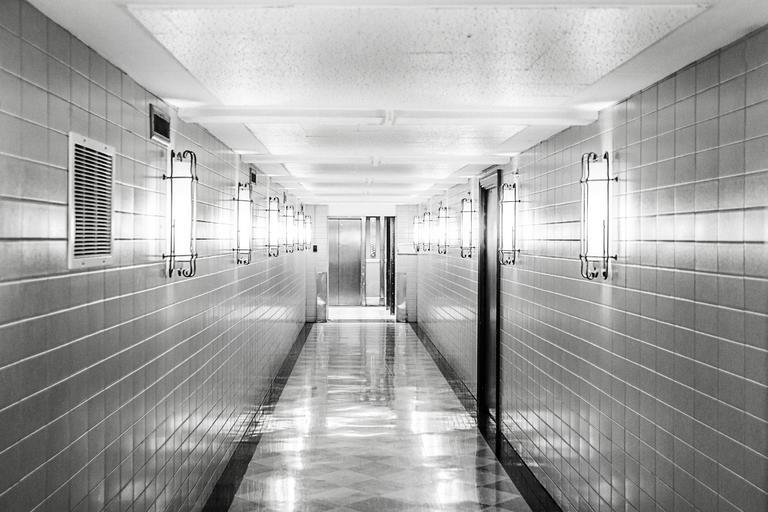 Keywords: corridor hallway floor tiles empty clean black and white shiny lights floors ceiling