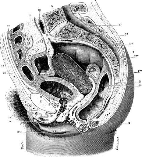 Keywords: Corset1908 186Fig89.png Fig 89 ” Coupe vertico-mĂ©diane de la partie infĂ©rieure du bassin d'après Testut <br>1 Rectum ” 15 Corps de l'utĂ©rus ” 17 Vagin avec son orifice ” 24' Petite lèvre ” 24 Grande lèvre ” F La vessie page 186 1908 Doctcur O'FOLLOWELL PD Image Corset1908_186 png PD-old Testut ” TraitĂ© d'anatomie Le Corset 1908 Language-neutral diagrams |
