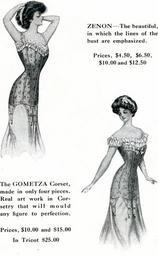 Keywords: CorsetStyles1909-1910p04.png en ZENON ”The beautiful in which the lines of the bust are emphasized <br>Prices 4 50 6 50 10 00 and 12 50<br>The GOMETZA Corset made in only four pieces Real art work in Corsetry that will mould any figure to perfection <br>Prices 10 00 and 15 00 In Tricot 25 00 Corset Styles 1909-1910 Woolnough-Corsetiers 1909 PD PD-Art Corset Styles 1909-1910 |