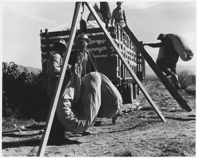 | Keywords: Cortaro Farms, Pinal County, Arizona. Cotton pickers weigh, haul, and dump their sacks at the cotton . . . - NARA - 522505.jpg Scope and content Full caption reads as follows Cortaro Farms Pinal County Arizona Cotton pickers weigh haul and dump their sacks at the cotton wagon on large-scale industrialized farm General notes 522505 Local identifier 83-G-44336 Department of Agriculture Bureau of Agricultural Economics Division of Economic Information ca 1922 - ca 1953 NARA-Author Lange Dorothea 1895-1965 Photographer 1372774 <br /> Still Picture Records Section Special Media Archives Services Division NWCS-S National Archives at College Park 8601 Adelphi Road College Park MD 20740-6001 1940-11 Record group Record Group 83 Records of the Bureau of Agricultural Economics 1876 - 1959 Record group ARC 412 Photographic Prints Documenting Programs and Activities of the Bureau of Agricultural Economics and Predecessor Agencies compiled ca 1922 - ca 1947 documenting the period ca 1911 - ca 1947 Series ARC 521048 File unit File unit ARC Variant control numbers NAIL Control Number NWDNS-83-G-44336 Other versions <gallery> File Cortaro_Farms _Pinal_County _Arizona _Cotton_pickers_weigh _haul _and_dump_their_sacks_at_the_cotton_ _ _ _-_NARA_-_522505 tif tif File Cortaro_Farms _Pinal_County _Arizona _Cotton_pickers_weigh _haul _and_dump_their_sacks_at_the_cotton_ _ _ _-_NARA_-_522505 jpg jpg </gallery> NARA-cooperation PD-USGov Cortaro Farms Cotton harvesting Dorothea Lange Cotton sacks 1940 in Arizona November 1940 in the United States Agricultural vehicles Men at work in the United States Agricultural workers Ladders Weighing scales in the United States |