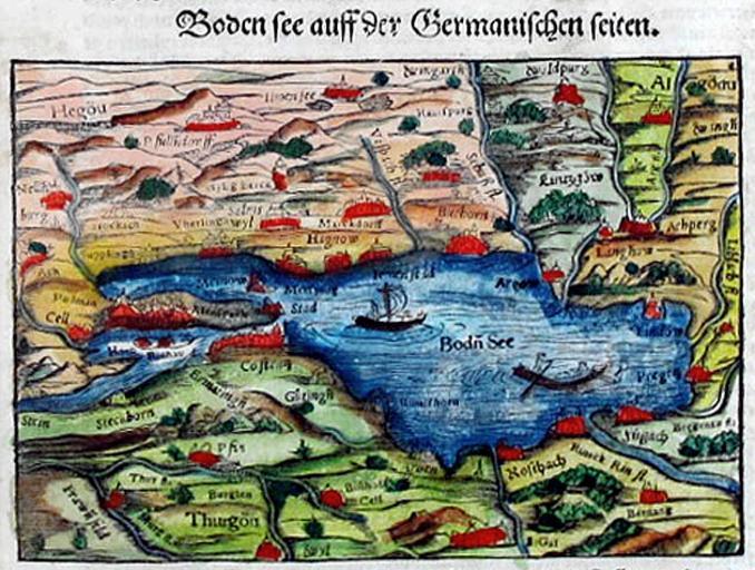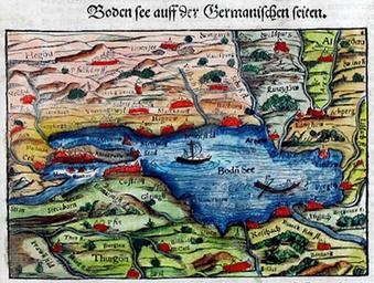 Keywords: Cosmographia Bodensee koloriert.jpg Bodensee auff der Germanischen Seiten kolorierter Holzschnitt aus der Cosmographia von Sebastian Münster Ende 16 Jh http //www zeller de/ zeller de century 16 author PD-old Images from Auktionshaus Zeller Old maps of Lake Constance Cosmographia |