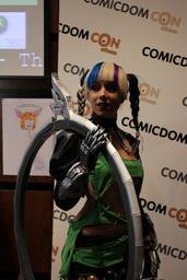 | Keywords: Cosplay at Comicdom 2012 in Athens, Greece 04.JPG en A cosplayer identified as Sofia Lucifairy wearing a self-made costume representing the Tira character from Soulcalibur V poses for the photojournalist's camera at Comicdom 2012 an annual cosplay competition held at Hellenic American Union in Kolonaki Athens Greece Photo donated to the public domain free of copyright restrictions Journalistic use For Journalistic use 2012-03-31 18 11 07 own Cogiati cc-zero consent public place Canon EF 50mm f/2 5 Compact Macro Canon EOS 60D Cosplay of Tira Soulcalibur Green clothing female Cosplay at Comicdom 2012 Taken with Canon EOS 60D Taken with Canon EF 50mm F2 5 Compact Macro |