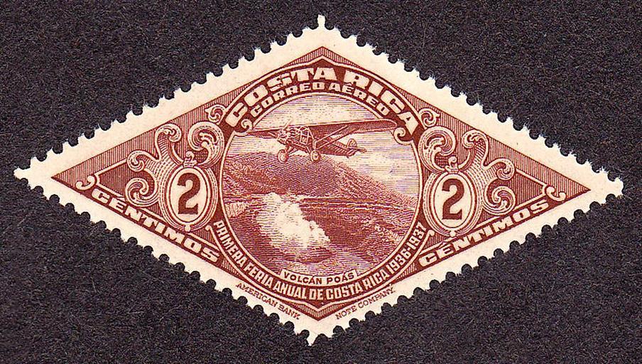 Keywords: Costa Rica Diamond stamp2 1937-2c.jpg en Postage stamp Coasta Rica 1937 2c brown diamond shape stamp Costa Rica government Post Office / Gwillhickers Hi-res scan of Costa Rica postage stamp from private collection Costa Rica Post Office 1937 PD-old Stamps of Costa Rica 1937 stamps Airmail stamps Brown stamps |