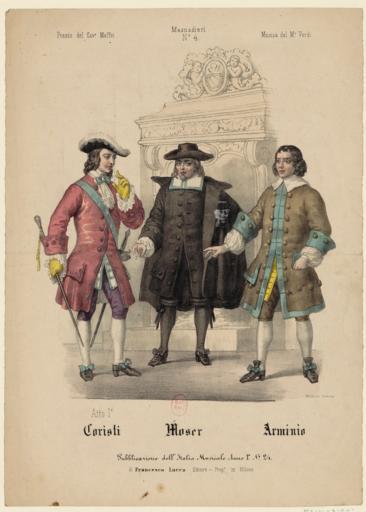 | Keywords: Costumes for Act I of Giuseppe Verdi's I masnadieri - Original.png Costumes for Act I of Giuseppe Verdi's en I masnadieri showing Coristi Chorister Moser and Arminio presumably from the original performance http //gallica bnf fr/ark /12148/btv1b8438469r Gallica; original source L'Italia Musicale Anno 1 n°24; edited Francesco Lucca Milano L'Italia Musicale started in 1847 and this is from its first year Anno 1 so 1847 or early 1848 Lit Corbetta presumably lithographed by Corbetta - this appears to be Francesco Corbetta 1815- Artist uncredited File Costumes for Act I of Giuseppe Verdi's I masnadieri jpg - Restoration JPEG File Costumes for Act I of Giuseppe Verdi's I masnadieri png - Restoration PNG File Costumes for Act I of Giuseppe Verdi's I masnadieri - Original png - Original PNG Since Corbetta was born in 1815 we can state with certainty this is PD-Old-70 |