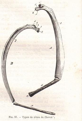 | Keywords: CoteChevalChauveau1980.jpg en Two types of ribs of horse Equus caballus the 5th true rib internal view and the 1st false rib external view fr Deux types de côtes du cheval Equus caballus la 5e sternale ou vraie côte Costae verae vue interne et la 1re asternale Costae spuriae vue externe <br /> 1 tête de la côte Caput costae <br /> 2 scissure de la côte <br /> 3 col de la côte Collum costae <br /> 4 tubercule tubérosité de la côte Tuberculum costae <br /> 5 facette articulaire de la côte <br /> 6 fossette rugueuse pour l'insersion du ligament interosseux transverso-costal <br /> 7 sillon costal gouttière de la face externe de la côte Sulcus costae <br /> 8 scissure vasculo-nerveuse du bord postérieur de la côte <br /> 9 cartilage costal cartilage de prolongement de la côte Cartilago costalis <br /> 10 renflement articulaire qui répond au sternum <br /> ” Chauveau Auguste Arloing Saturnin Traité d'anatomie comparée des animaux domestiques 1 064 p page 101 1890 Paris Lib J B Baillière et Fils domaine public décès des auteurs 1917 et 1911 Meyer C 2011-03-12 PD-old Horse bones Ribs skeleton |