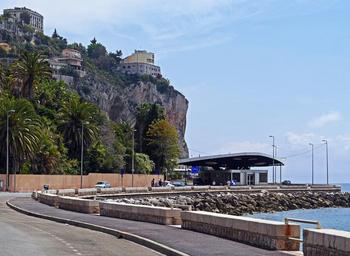 Keywords: country border france-italy mediterranean bank shore protection rock steep mountain building abyss palm trees menton ventimiglia clearance cross station coastal road coast homes riviera côte d ' azur alpes maritimes south of france