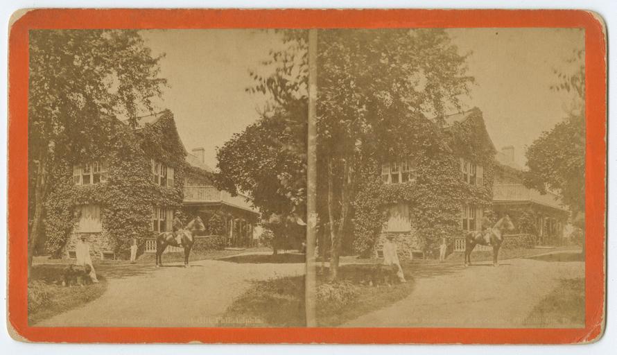 Keywords: stereographs chestnut hill chestnuthill philadelphia houses photo border Shows a large house with extensive grounds in Chestnut Hill, Philadelphia. In front of the house, a horse with rider and two men stand on a path lined with trees and grass. Grounds include an ivy-covered stone building. Accession number: P.2011.47.713 Shows a large house with extensive grounds in Chestnut Hill, Philadelphia. In front of the house, a horse with rider and two men stand on a path lined with trees and grass. Grounds include an ivy-covered stone building. Accession number: P.2011.47.713 |
