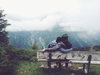 Keywords: couple love romance romantic guy girl people cuddling bench nature outdoors fog clouds