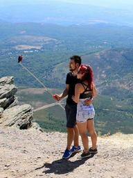 Keywords: couple selfie in love promenade mountain camera photography photographer young woman young man the groom husband the bride wife married couple redhead tennis love valentine feast of love holiday person