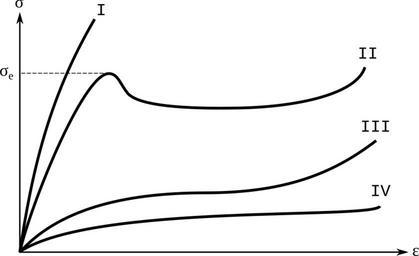 Keywords: Courbe traction polymeres.svg en Tensile testing curves for polymers I brittle; II viscoelastic with flowing threshold <sub>e</sub>; III viscoleastic without threshold; IV viscoplastic fr COurbe de traction pour des polymères I fragile ; II viscoélastique avec seuil d'écoulement <sub>e</sub> ; III viscoélastique sans seuil d'écoulement ; IV viscoplastique own from J P Trotignon M Piperaud J Verdu A Dobraczynski Précis de matières plastiques ed Nathan/Afnor Paris 1993 p 29 Cdang 2011-05-09 courbe traction visco svg inkscape Cc-zero Stress-strain curves Polymer diagrams Plastic deformation |