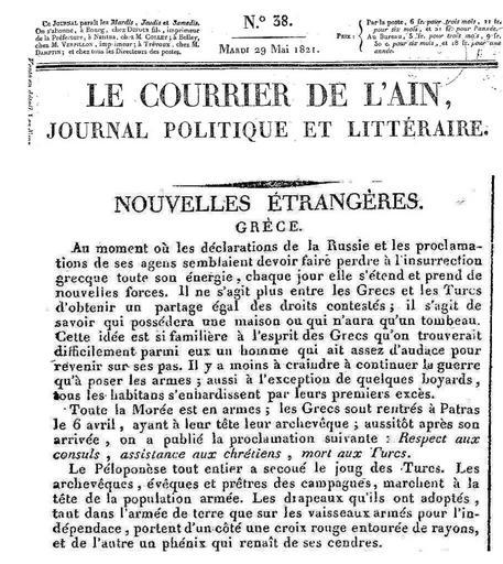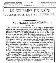 Keywords: Courier Ain 1821 Patra+title.JPG en News about the outbreak of the Greek Revolution in Patras 25 March/6 April 1821 el Η είδηση για την έκρηξη της Ε ανάστασης στην Πάτρα 25 αρτίου/6 Α ριλίου 1821 1821-05-29 Courrier de l' Ain newspaper 29 May 1821 p 4 http //www archives-numerisees ain fr/archives/resultats/journauxnumerises/n 100 RECH_nom 5B0 5D Courrier+de+l 27Ain type journauxnumerises anonymous other versions PD-old-70-1923 Uploaded with UploadWizard Greek Revolution 1821 Palaion Patron Germanos