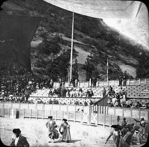 Keywords: blackandwhite monochrome outdoor black and white Fonds Trutat - Photographie ancienne Cote : TRU C 151 Localisation : Fonds ancien Original non communicable Titre : Courses de taureaux, Luchon, 3 juillet 1899 Auteur : Trutat, Eugène Rôle de l’auteur : Photographe Lieu de création : Bagnères-de-Luchon (Haute-Garonne) Date de création : : 1899 Mesures : 12 x 9 cm Mot(s)-clé(s) : -- Tauromachie -- Arènes -- Gradins -- Spectateur -- Torero -- Cape -- Bagnères-de-Luchon (Haute-Garonne) -- Soupirs, allée des (Bagnères-de-Luchon) -- Pique (France ; vallée) -- Pyrénées (France) -- 19e siècle, 4e quart Médium : Photographies -- Positifs au collodion sur plaque de verre -- Noir et blanc -- Scènes Bibliographie : Frappé (Jean-Bernard). - Autrefois Bagnères de Luchon. Tome I. - Anglet : Atlantica, 2001. - 345 p. ; 15 x 22 cm. - (Autrefois) cf. p. 246-247. Sous Original non communicable URL : numerique.bibliotheque.toulouse.fr/cgi-bin/library?c=phot... Bibliothèque de Toulouse. Domaine public Fonds Trutat - Photographie ancienne Cote : TRU C 151 Localisation : Fonds ancien Original non communicable Titre : Courses de taureaux, Luchon, 3 juillet 1899 Auteur : Trutat, Eugène Rôle de l’auteur : Photographe Lieu de création : Bagnères-de-Luchon (Haute-Garonne) Date de création : : 1899 Mesures : 12 x 9 cm Mot(s)-clé(s) : -- Tauromachie -- Arènes -- Gradins -- Spectateur -- Torero -- Cape -- Bagnères-de-Luchon (Haute-Garonne) -- Soupirs, allée des (Bagnères-de-Luchon) -- Pique (France ; vallée) -- Pyrénées (France) -- 19e siècle, 4e quart Médium : Photographies -- Positifs au collodion sur plaque de verre -- Noir et blanc -- Scènes Bibliographie : Frappé (Jean-Bernard). - Autrefois Bagnères de Luchon. Tome I. - Anglet : Atlantica, 2001. - 345 p. ; 15 x 22 cm. - (Autrefois) cf. p. 246-247. Sous Original non communicable URL : numerique.bibliotheque.toulouse.fr/cgi-bin/library?c=phot... Bibliothèque de Toulouse. Domaine public |