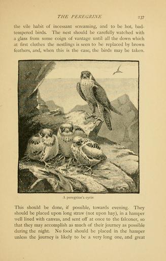 Keywords: Coursing and falconry (Page 237) (5619933250).jpg THE PEREGRINE <br> '-VJ <br> the vile habit of incessant screaming and to be hot bad- <br> tempered birds The nest should be carefully watched with <br> a glass from some coign of vantage until all the down which <br> at first clothes the nestlings is seen to be replaced by brown <br> feathers and when this is the case the birds may be taken <br> A peregrine's eyrie <br> This should be done if possible towards evening They <br> should be placed upon long straw not upon hay in a hamper <br> ' veil lined with canvas and sent off at once to the falconer so <br> that they may accomplish as much of their journey as possible <br> during the night No food should be placed in the hamper <br> unless the journey is likely to be a very long one and great 31703347 98862 45595 Page 237 Text http //www biodiversitylibrary org/page/31703347 1892 10 5962/bhl title 45595 Cox Harding; Lascelles Gerald Biodiversity Heritage Library TWITTER POSTS Encyclopedia of Life Images taxonomy common Peregrine falcon taxonomy binomial Falco peregrinus taxonomy common peregrine falcon taxonomy binomial falco peregrinus Information field Flickr posted date ISOdate 2011-04-14 PD-old-70-1923 Coursing and falconry Photos uploaded from Flickr by Fæ using a script Files from the Biodiversity Heritage Library released as Attribution-NonCommercial-ShareAlike |