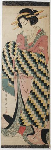 Keywords: Courtesan tying an her obi with tissue papers in her mouth (5765886172).jpg en <b>Accession Number </b> 1957 164 <b>Display Artist </b> Kikukawa Eizan <b>Display Title </b> Courtesan tying an her obi with tissue papers in her mouth <b>Creation Date </b> 1810-1820 <b>Medium </b> Woodblock <b>Height </b> 29 7/8 in <b>Width </b> 9 7/8 in <b>Display Dimensions </b> 29 7/8 in x 9 7/8 in 75 88 cm x 25 08 cm <b>Credit Line </b> Bequest of Mrs Cora Timken Burnett <b>Label Copy </b> In this suggestively erotic image of a fashionable prostitute the artist delights in the swaths of checkered fabric of her obi which she ties in front without assistance Since her hands are occupied she clutches in her mouth the tissues used to keep herself clean after each customer Large vertical prints of this scale were mounted as hanging scrolls for those who were unable to afford paintings <b>Label Copy Spanish </b> En esta imagen sugestivamente ertica de una prostituta a la moda el artista se deleita representando las tiras de tela a cuadros de su obi el cual anuda de frente sin ayuda Como tiene las manos ocupadas en la boca tiene los papeles que usa para limpiarse despus de cada cliente Los grabados grandes verticales de esta escala se montaban como rollos colgantes para aquellos que no tenan dinero para comprar pinturas <b>Collection </b> http //www sdmart org/art/our-collection/asian-art The San Diego Museum of Art 2009-03-18 00 49 42 https //www flickr com/photos/thesandiegomuseumofartcollection/5765886172/ Flickr en thesandiegomuseumofartcollection PD-old-100 Art of Japan in the San Diego Museum of Art |