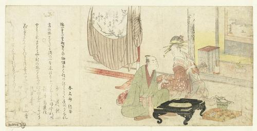 Keywords: Courtisane schenkt thee voor haar gast-Rijksmuseum RP-P-1969-11.jpeg accession number RP-P-1969-11 Kubota Shunman; Kubota Shunman died 1820; Donmeisai Tadayasu; Shôshô Michiyori; Haginoya-ô Urasumi died 1810; Asakusaan Ichindo died 1821; Yomo Magao; Shôsadô died 1820 credit line GWToolset Rijksmuseum nl Een courtisane met een porseleine theepot serveert haar gast De man zijn kimono is uitgehangen op het rek achter Met vijf gedichten Het gedicht van de kunstenaar zelf Hij zei tegen zijn vrouw 'Ik ga even naar de avond pruimenbloesem kijken en ben zo terug' maar wat is die sterke geur op zijn mouwen Label Line mentioned on object Kubota Shunman 1757 - 1820 1795 - 1799 kleurenhoutsnede; blinddruk; lijnblok in zwart met kleurblokken Collection prenten; Japan collectie blad Height mm 138 blad Width mm 284 exhibition history Institution Rijksmuseum paper object history Acquisition 1969 object type prent PD-US PD-old Data and photography rights All data and all images made available through the API are either in the public domain or are subject to a CC0 license https //www rijksmuseum nl/en/api/terms-and-conditions-of-use cc-zero place of creation Japan Forrer 65; Jap Cat II 44 http //www rijksmuseum nl/collectie/RP-P-1969-11 http //hdl handle net/10934/RM0001 COLLECT 45500 handle Courtisane schenkt thee voor haar gast Uploaded with GWToolset Rijksmuseum RP-P-1969-11 http //www rijksmuseum nl/media/assets/RP-P-1969-11 Images uploaded by Fæ Images from the Rijksmuseum Japanese 18th-century prints in the Rijksmuseum Amsterdam |