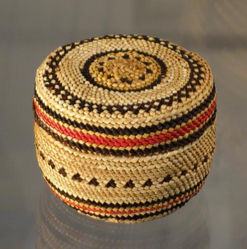 Keywords: Covered Basket, Makah people, Northwest Washington, undated, twined bear grass, cedar bark, sedge - Chazen Museum of Art - DSC01843.JPG en Exhibit in the Chazen Museum of Art University of Wisconsin-Madison Madison Wisconsin USA This artwork is old enough so that it is in the public domain Photography was permitted in the museum without restriction 2013-07-21 12 59 01 own Daderot cc-zero Native American baskets in the Chazen Museum of Art Uploaded with UploadWizard Makah |