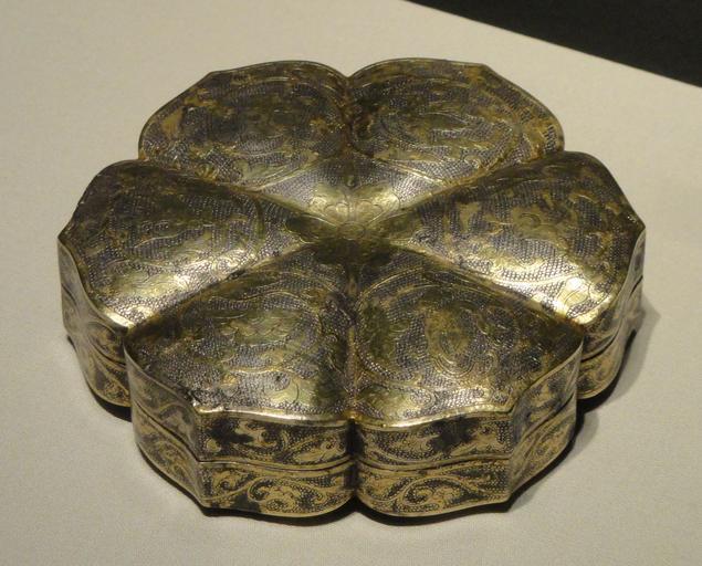 Keywords: Covered box in form of a flower, view 2, probably Chang'an, Shaanxi province, China, early to mid Tang dynasty, late 7th-early 8th century AD, hammered silver - Freer Gallery of Art - DSC05610.JPG en Exhibit in the Freer Gallery of Art Washington DC USA This artwork is old enough so that it is in the public domain Photography was permitted in the museum without restriction 2013-02-12 15 58 42 own Daderot cc-zero Metalwork of China in the Freer Gallery of Art Uploaded with UploadWizard |
