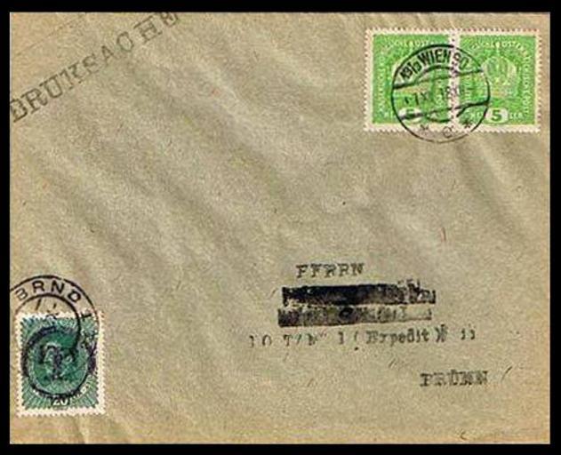 | Keywords: CoverWien-Brno1918.jpg ru Почтовый конве т отп авленный из Вены в Б но с доплатной ма кой Чехословакии en Cover sent in 1918 from Vienna 90 District 13 Breitensee with a 5 heller pair issue 1916 to Brno Moravia with additional 20 h franking issue 1917 and a T for Tax postmark personal collection author 1918 1916 stamps of Austria Postmarks of Czech lands before 1918 Postmarks of Austria PD-old Postmarks uncategorised by city 1918 postmarks | ||||