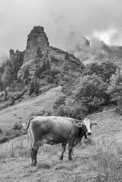 Keywords: cow mountains alp switzerland canton of glarus wild black and white clouds fog rock pasture mountain meadows landscape nature alpine