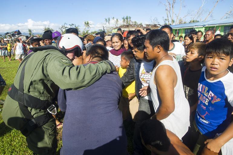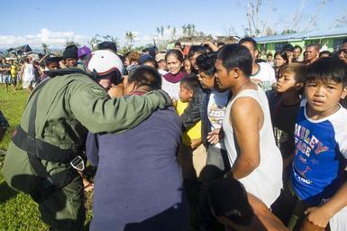 Keywords: Cowpens sailors bring smiles and snacks to children of the Philippines 131118-N-BX824-021.jpg en Naval Aircrewman 3rd Class Peter Olson from Howell N J is thanked by Philippine citizens after delivering supplies from an SH-60B Seahawk helicopter from the Scorpions of Helicopter Anti-Submarine Squadron Light 49 Det 6 assigned to the Ticonderoga class guided-missile cruiser USS Cowpens in support of Operation Damayan Cowpens is with the George Washington Strike Group supporting the 3rd Marine Expeditionary Brigade which is assisting the Philippine government ™s ongoing relief efforts in the aftermath of the super typhoon Haiyan/Yolanda 2013-11-18 Tactical Helicopter https //www dvidshub net/image/1055825 131118-N-BX824-021 2013-11-19 06 26 LEYTE PH PD-USGov-Military-Navy Operation Damayan Images from DoD uploaded by Fæ |