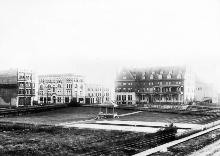 Keywords: blackandwhite monochrome outdoor black and white The C.P.R. Park on the north side of Georgia Street between Granville and Howe Streets in Vancouver, BC. Note the tennis courts. 1893 photograph; Southern view (likely from the Manor House hotel). Photograph shows (left to right) the Hudson's Bay store under construction (completed September 1893; demolished March 1926), Lord Strathcona (Sir Donald A. Smith) Block (built 1889-90), Lord Durham Block (built c.1890), Lord Eliphin Stone Block (built c.1890) and the first CPR Hotel Vancouver (built 1887-88). Behind the Hotel Vancouver, to the right, can be seen the Vancouver Opera House (1891). [City of Vancouver Archives] The C.P.R. Park on the north side of Georgia Street between Granville and Howe Streets in Vancouver, BC. Note the tennis courts. 1893 photograph; Southern view (likely from the Manor House hotel). Photograph shows (left to right) the Hudson's Bay store under construction (completed September 1893; demolished March 1926), Lord Strathcona (Sir Donald A. Smith) Block (built 1889-90), Lord Durham Block (built c.1890), Lord Eliphin Stone Block (built c.1890) and the first CPR Hotel Vancouver (built 1887-88). Behind the Hotel Vancouver, to the right, can be seen the Vancouver Opera House (1891). [City of Vancouver Archives] |