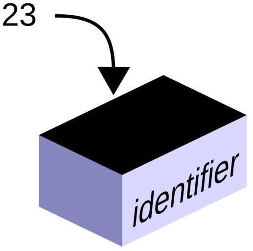 Keywords: CPT-programming-variable.svg en A diagram showing how a variable works and the command dim identifier as integer 23 is performed own Pluke 2012-02-21 inkscape Programming diagrams Variables Cc-zero