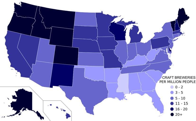 | Keywords: Craft Breweries Per Capita (US).svg Valid SVG Inkscape en United States microbreweries regional breweries and brew pubs per capita by state Brewery data from the state locator at http //www brewersassociation org/pages/directories/find-us-brewery Population data from Wikipedia Highest ten per capita are Oregon 42 per million Colorado 42 Montana 41 Vermont 40 Alaska 37 Maine 31 Wyoming 30 Washington 28 Idaho 21 and Wisconsin 19 Data current as of April 18 2012 2012-12-03 17 57 24 File Craft_Breweries_Per_Capita_ US png and Brewers Association User Northwest-historian and User Alataristarion PNG Original and User EdwardRech SVG File Blank US Map svg Custom license marker 2012 12 03 Alataristarion Breweries in the United States Breweries in Oregon Breweries in Colorado Breweries in Montana Breweries in Vermont Breweries in Alaska Breweries in Maine Breweries in Wyoming Breweries in Washington state Breweries in Idaho Breweries in Wisconsin Brew pubs Economic maps of the United States Uploaded with UploadWizard |