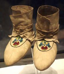 Keywords: Cree moccasins, c. 1920, caribou skin - Bata Shoe Museum - DSC00689.JPG en Exhibit in the Bata Shoe Museum Toronto Ontario Canada This item is old enough so that its design is in the public domain The museum permitted photography without restriction 2013-07-04 11 40 16 own Daderot cc-zero Moccasins in the Bata Shoe Museum Uploaded with UploadWizard Cree moccasins |