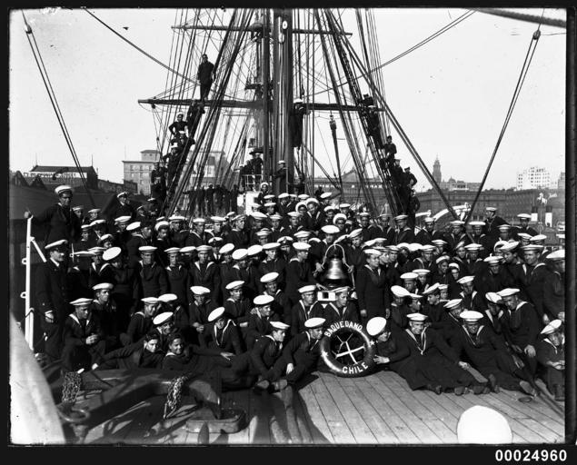 | Keywords: samuel j hood collection samueljhoodcollection baquedano corvette sydney harbour sydneyharbour harbour scenes harbourscenes circular quay circularquay people chilean “naval vessel” sailor sailors blackandwhite monochrome photo border black and white The GENERAL BAQUEDANO moored at East Circular Quay on 16 July 1931 and the crew spent two weeks in Sydney. The ship had previously visited Sydney in 1903. In 1931, the vessel was considered obsolete as a fighting ship, but very useful as a training vessel. In naval categories, GENERAL BAQUEDANO is known as a corvette (in Spanish corbeta), which is defined as a flush-decked ship with one tier of guns, a type replaced by the modern cruiser. Fully-rigged, the vessel was fitted with triple-expansion engines as auxiliary, and had a displacement of 2,330 tons. The visit attracted significant public interest and the daily activities of the Chileans were reported in the Sydney Morning Herald. The crew played a soccer match against members of the HMAS CANBERRA crew, laid a wreath at the Martin Place cenotaph, displayed their rigging skills while aloft and opened their vessel to the public. Captain Alvarez also hosted visits by the Governor of NSW Sir Phillip Game, the Premier of NSW and the Lord Mayor. The departure of GENERAL BAQUEDANO from Sydney Harbour was quite eventful, with one rating attempting to desert the ship and swim ashore, two sailors being left at the dock and transported to the vessel by police launch and another bewildered Chilean was found wandering the streets. He was later reunited with his fellow sailors in Auckland after transport was arranged on a departing cargo ship. This photo is part of the Australian National Maritime Museum’s Samuel J. Hood Studio collection. Sam Hood (1872-1953) was a Sydney photographer with a passion for ships. His 60-year career spanned the romantic age of sail and two world wars. The photos in the collection were taken mainly in Sydney and Newcastle during the first half of the 20th century. The ANMM undertakes research and accepts public comments that enhance the information we hold about images in our collection. This record has been updated accordingly. Photographer: Samuel J. Hood Studio Collection Object no. 00024960 The GENERAL BAQUEDANO moored at East Circular Quay on 16 July 1931 and the crew spent two weeks in Sydney. The ship had previously visited Sydney in 1903. In 1931, the vessel was considered obsolete as a fighting ship, but very useful as a training vessel. In naval categories, GENERAL BAQUEDANO is known as a corvette (in Spanish corbeta), which is defined as a flush-decked ship with one tier of guns, a type replaced by the modern cruiser. Fully-rigged, the vessel was fitted with triple-expansion engines as auxiliary, and had a displacement of 2,330 tons. The visit attracted significant public interest and the daily activities of the Chileans were reported in the Sydney Morning Herald. The crew played a soccer match against members of the HMAS CANBERRA crew, laid a wreath at the Martin Place cenotaph, displayed their rigging skills while aloft and opened their vessel to the public. Captain Alvarez also hosted visits by the Governor of NSW Sir Phillip Game, the Premier of NSW and the Lord Mayor. The departure of GENERAL BAQUEDANO from Sydney Harbour was quite eventful, with one rating attempting to desert the ship and swim ashore, two sailors being left at the dock and transported to the vessel by police launch and another bewildered Chilean was found wandering the streets. He was later reunited with his fellow sailors in Auckland after transport was arranged on a departing cargo ship. This photo is part of the Australian National Maritime Museum’s Samuel J. Hood Studio collection. Sam Hood (1872-1953) was a Sydney photographer with a passion for ships. His 60-year career spanned the romantic age of sail and two world wars. The photos in the collection were taken mainly in Sydney and Newcastle during the first half of the 20th century. The ANMM undertakes research and accepts public comments that enhance the information we hold about images in our collection. This record has been updated accordingly. Photographer: Samuel J. Hood Studio Collection Object no. 00024960 |