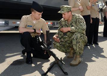 Keywords: CRG1 NJROTC 150415-N-DI719-065.jpg en 150415-N-DI719-065 IMPERIAL BEACH Calif April 15 2015 - Gunner's Mate 2nd Class Anthony Hernandez describes an M240 machine gun to a Navy Junior Reserve Officers Training Corps NJROTC cadet from Edward C Reed High School during a tour of Coastal Riverine Group 1 Coastal Riverine Force is a core Navy capability that provides port and harbor security high value asset protection and maritime operations in coastal and inland waterways U S Navy photo by Chief Mass Communication Specialist Elena Hawthorne/RELEASED 2015-04-15 Chief Petty Officer Elena Pence https //www dvidshub net/image/1877553 150415-N-DI719-065 2015-04-16 14 32 IMPERIAL BEACH CA US PD-USGov-Military-Navy M-240 machine gun Images from DoD uploaded by Fæ |