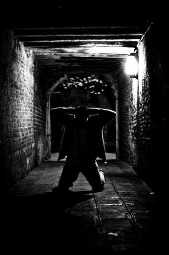 Keywords: crime kneeling victim tunnel people man shadow person human light dark silhouette underground black male corridor