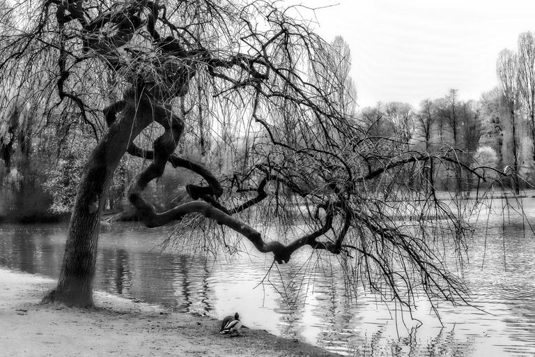 Keywords: crippled stunted tree lake pond water black and white ducks animals park