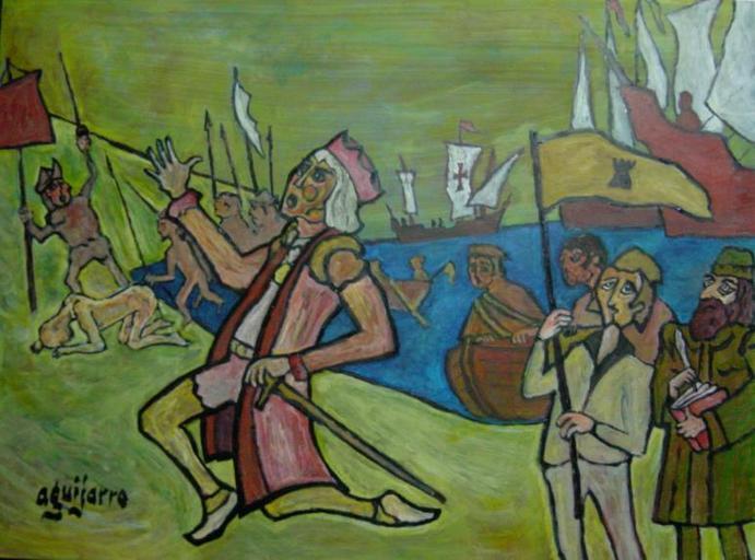 Keywords: Cristobal Colón - Descubrimiento del Continente Colombino.JPG Cristobal Colón y su tripulación protagonizaron uno de los momentos cumbres de la Historia de la Humanidad al encontrar el 12 de octubre de 1492 un maravilloso obstáculo en su camino el Nuevo Mundo abriendo en forma gloriosa la llamada Edad Moderna A pesar de un evidente error de cálculo en las distancias Cristobal Colón fue acertado en sus predicciones como ninguno de sus contemporáneos y arrojado como el que más para lanzarse en pos de sus hermosos sueños por una ruta más que peligrosa Cristobal Colón realizó cuatro viajes de ida y vuelta desde España hasta las tierras descubiertas que estaban habitadas por descendientes de tribus siberianas emigradas en el Pleistoceno el periodo más antiguo del Cuaternario Si bien los vikingos en sus arriesgadas incursiones llegaron a pisar tierras americanas algunos siglos antes de que lo hiciera Cristobal Colón es incontrovertible el hecho de que tan solo a partir de los viajes de Colon es cuando Nuevo y Viejo Mundos han quedado permanentemente vinculados en una Civilización e Historia comunes Desde entonces los flujos de lenguajes creencias flora fauna y materias entre Europa y América no han dejado de influir trascendentalmente en el cotidiano vivir de los seres humanos de ambos continentes La República de Colombia recibió este nombre como homenaje a Colón Una gran parte de la Humanidad no acabamos de comprender por qué esa denominación no se le ha aplicado a todo el territorio descubierto en aquella gesta inolvidable En justicia y de acuerdo con las más elementales lógica y semántica el Continente Colombino nunca debería haberse llamado equívocamente americano Cristóbal Colón falleció en Valladolid España el día 20 de mayo de 1506 Desde entonces espera el día en que la Humanidad y sobretodo los habitantes actuales de la Europa que engrandeció y del Continente Colombino al que abrió las puertas reconozcan justamente la grandeza de su gesta y el protagonismo semántico que le corresponde Cristobal Colón - Descubrimiento del Continente Colombino injustamente llamado América por Aguijarro Antonio Guijarro Morales pintor y cardiólogo natural de Guadix Granada http //personal telefonica terra es/web/medicina/ultimas html Título del enlace Pinturas de Aguijarro 2007-03-20 own assumed Aguijarroo http //personal telefonica terra es/web/medicina/ultimas html Título del enlace Pinturas de Aguijarro Aguijarro Christopher Columbus in art |