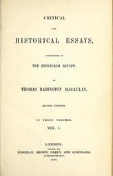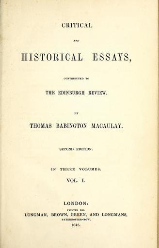 | Keywords: Critical and Historical Essays 1843 2nd edition.jpg  Critical and Historical Essays Macaulay 2nd edition title page https //archive org/details/criticalhistoric01maca_0 1843 Thomas Babington Macaulay/Published by Longman Brown Green and Longmans London 1843 Thomas Babington Macaulay 1st Baron Macaulay PD-old-70-1923 |