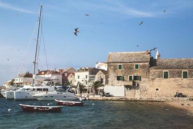 Keywords: croatia sea primosten boats shore town seaside seagull bird sky