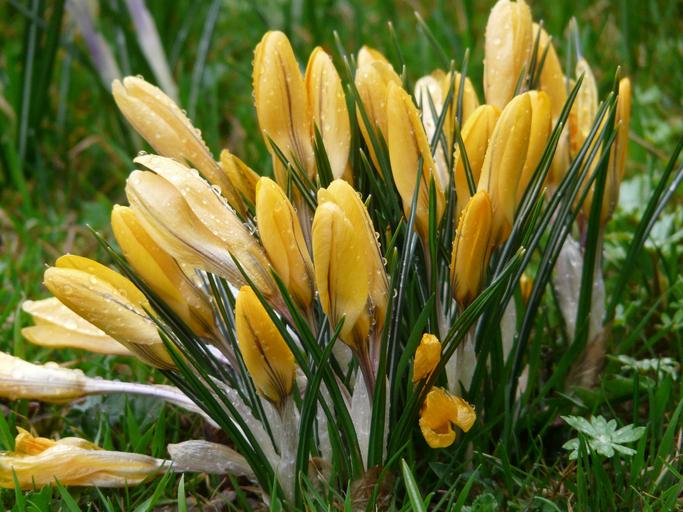 Keywords: crocus schwertliliengewaechs flower garden rain wet yellow raindrop water spring meadow