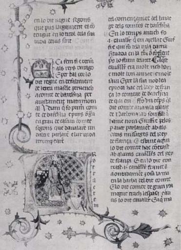 Keywords: Crònica dels reys d'Aragó e comtes de Barcelona BGUS ms 2664 f22v bn.jpg CRÃ’NIQUES DEL REIS D'ARAGÓ E COMTES DE BARCELONA <br/> Crònica general de Pere III el Cerimoniós dita comumnament Crònica de Sant Joan de la Penya <br/> <br/> CapÃtol XXI COM FINà LA GENERACIÓ MASCULINA DELS REIS D'ARAGÓ <br/> Acà fem fi e terme als reis d'Aragó E per tal com lo dit regne en defalliment d'hereu mascle pervenc a comte de Barcelona per ajustament matrimonial vejam qui fo primer comte de Barcelona e puis de grau en grau de cascun comte segons que davallaren un d'altre parlarem e llur vida recontarem <br/> <br/> CapÃtol XXII DEL COMENÇAMENT DELS COMTES DE BARCELONA <br/> Ara tactem del començament del llinatge dels comtes de Barcelona En lo temps antic fo un cavaller qui era apellat Guifré qui fo de la vila d'Arrià situada en la terra de Conflent pres lo flum de la Tet Aquest cavaller era molt ric hom e molt armat e molt savi E per la sua noblea e proea hac del rei de França lo comtat de Barcelona de qui era Fo un temps el dit comte anà a la ciutat de Narbona ab son fill qui havia nom Guifré Pelós per haver <br/> <br/> http //books google com/books id OEs1oxNGZ68C lpg PA89 hl ca pg PA73 v onepage q f false <br/> <br/> El señal del rey de Aragón Historia y Significado <br/> El comte Guifré presta homenatge al rei de França pel comtat de Barcelona Cadascún apareix identificat per les seves armes el primer porta d'or quatre pals de gules i el segon dimidiat de l'Imperi i França Pintura al temple i aplicacions d'or sobre el pergamà Inicial miniada lletra A del cap 22 de la versió catalana de la Crònica de Sant Joan de la Penya Biblioteca de la Universitat de Salamanca ms 2664 f 22v <br/> <br/> Por supuesto Pedro IV sabÃa positivamente que esa era su señal familiar y además de dignidad nostre senyal reyal por usar su propia expresión y no es imposible que creyese que procesÃan por lÃnea agnaticia de la dinastÃa condal catalana Lo cierto es que la documentación conservada no dice nada que permita atribuir al monarca ninguna de las dos representaciones Pese a todo hay un dato que parece argüir en pro de esta hipótesis Se trata de una miniatura de la versión catalana de la obra conocida como Crónica de San Juan de la Peña realizada bajo el patrocinio de Pedro IV entre 1369 y 1372 según el manuscrito 2664 de la Biblioteca de la Universidad de Salamanca coetáneo a su redacción y salido seguramente del escritorio regio La miniatura aludida es la que decora la capitular historiada A que abre el capÃtulo 22 de la citada crónica f 22v donde se da comienzo a su segunda parte la historia genealógica de los condes de Barcelona lám II Dentro del ojo de la letra aparece representado el conde Guifredo prestando homenaje al rey de Francia siendo cada uno identificado por su escudo de armas el primero trae de oro cuatro palos de gules y el segundo dimidiado del Imperio y Francia nota 12 sobre esta capital iluminada y el códice en general véase Planas 1992 Esta autora identifica erróneamente al conde baarcelonés representado en la miniatura con Guifredo el Velloso pero se trata en realidad de su padre llamda también Guifredo como deja claro el texto del capÃtulo Por otro lado esta ilustración plantea el problema que se presentará en otras ocasiones y en el que no es posible entrar ahora de la responsabilidad del mandante o comitente en los detalles concretos de la iluminación de un códice cf Riquer 1983 120 En cuanto a las armas atribuidas al rey de Francia son las que la tradición medieval asignaba a Carlomagno vid Neubecker 1976 0 174 y 230 Alberto Montaner Frutos; El señal del rey de Aragón Historia y Significado; pà g 10-11; i descripció de là m pà g 171 1995 1369-1372 Pere IV d'Aragó el Cerimoniós Pere terç Cròniques dels reis d'Aragó e comtes de Barcelona Casal d'Aragó PD-old-100 |