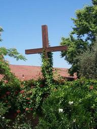 Keywords: cross wood wooden outdoor vines overgrown garden christianity symbol religion christian religious faith belief planting