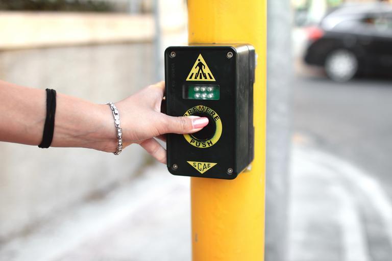 Keywords: crosswalk intersection street road city urban hand
