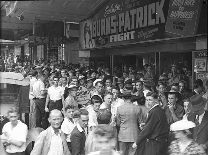 Keywords: state library of new south wales statelibraryofnewsouthwales men crowd people sport sporting event sportingevent boxing fight burns-patrick fight burnspatrickfight sign lyric hat sam hood samhood 1946 nitrate negative nitratenegative sydney, australia sydneyaustralia welterweight lyric theatre lyrictheatre blackandwhite monochrome black and white Format: Film photonegative (copied from original nitrate photonegative) ; 35 mm Notes: Before television, continuous newsreel film theatres were a necessary means of seeing current events. When Tommy Burns fought Vic Patrick at the Sydney stadium for the Australian welterweight crown, he was knocked out in the ninth round. The crowd was 13,000, with another 5,000 across the road listening to the radio broadcast. The newsreel of the event shown at the Lyric Theatre was even more popular with huge crowds in George Street for the six daily sessions. Find more photographs of early Sydney on Discover Collections - Sydney Exposed: www.sl.nsw.gov.au/discover_collections/society_art/photog... From the collections of the Mitchell Library, State Library of New South Wales www.sl.nsw.gov.au Information about photographic collections of the State Library of New South Wales: acms.sl.nsw.gov.au/search/SimpleSearch.aspx Persistent url: acms.sl.nsw.gov.au/item/itemDetailPaged.aspx?itemID=26624 Format: Film photonegative (copied from original nitrate photonegative) ; 35 mm Notes: Before television, continuous newsreel film theatres were a necessary means of seeing current events. When Tommy Burns fought Vic Patrick at the Sydney stadium for the Australian welterweight crown, he was knocked out in the ninth round. The crowd was 13,000, with another 5,000 across the road listening to the radio broadcast. The newsreel of the event shown at the Lyric Theatre was even more popular with huge crowds in George Street for the six daily sessions. Find more photographs of early Sydney on Discover Collections - Sydney Exposed: www.sl.nsw.gov.au/discover_collections/society_art/photog... From the collections of the Mitchell Library, State Library of New South Wales www.sl.nsw.gov.au Information about photographic collections of the State Library of New South Wales: acms.sl.nsw.gov.au/search/SimpleSearch.aspx Persistent url: acms.sl.nsw.gov.au/item/itemDetailPaged.aspx?itemID=26624 |