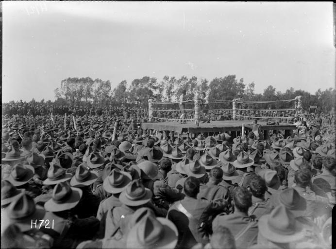 | Keywords: blackandwhite monochrome black and white A crowd of World War I soldiers watching two boxers sparring in a ring, during a boxing match at the New Zealand Divisional Sports at Authie, France. Photographed by Henry Armytage Sanders on 23 July 1918. Inscriptions: Inscribed - Photographer's title on negative -bottom left: H721. Quantity: 1 b&w original negative(s). Physical Description: Dry plate glass negative 4.75 x 6.5 inches Crowd of soldiers watching a boxing match at the New Zealand Divisional Sports, Authie. Royal New Zealand Returned and Services' Association :New Zealand official negatives, World War 1914-1918. Ref: 1/2-013325-G. Alexander Turnbull Library, Wellington, New Zealand. natlib.govt.nz/records/22910690 A crowd of World War I soldiers watching two boxers sparring in a ring, during a boxing match at the New Zealand Divisional Sports at Authie, France. Photographed by Henry Armytage Sanders on 23 July 1918. Inscriptions: Inscribed - Photographer's title on negative -bottom left: H721. Quantity: 1 b&w original negative(s). Physical Description: Dry plate glass negative 4.75 x 6.5 inches Crowd of soldiers watching a boxing match at the New Zealand Divisional Sports, Authie. Royal New Zealand Returned and Services' Association :New Zealand official negatives, World War 1914-1918. Ref: 1/2-013325-G. Alexander Turnbull Library, Wellington, New Zealand. natlib.govt.nz/records/22910690 |